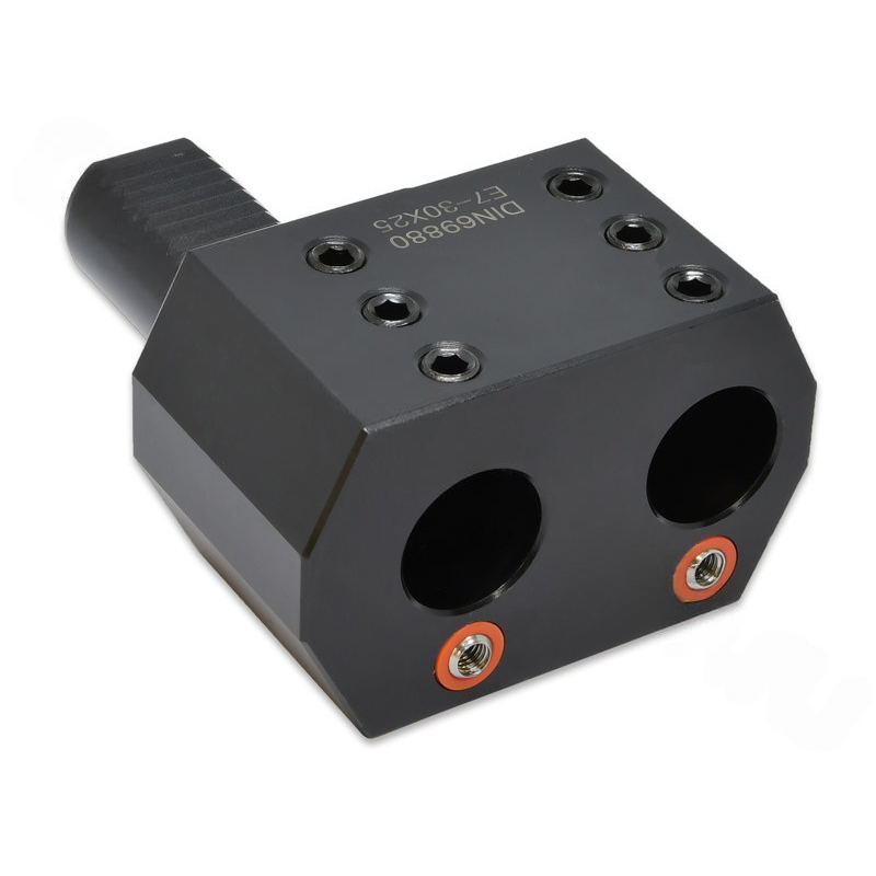 Двойной резцедержатель для цилиндрического хвостовика VDI типа E7 предназначен для установки расточных резцов с хвостовиком диаметром 50 мм. Хвостовик оправки соответствует стандарту VDI50. Данный блок VDI используется в основном для надежной фиксации расточных резцов и другого осевого инструмента, где требуется подача охлаждающей жидкости снаружи.